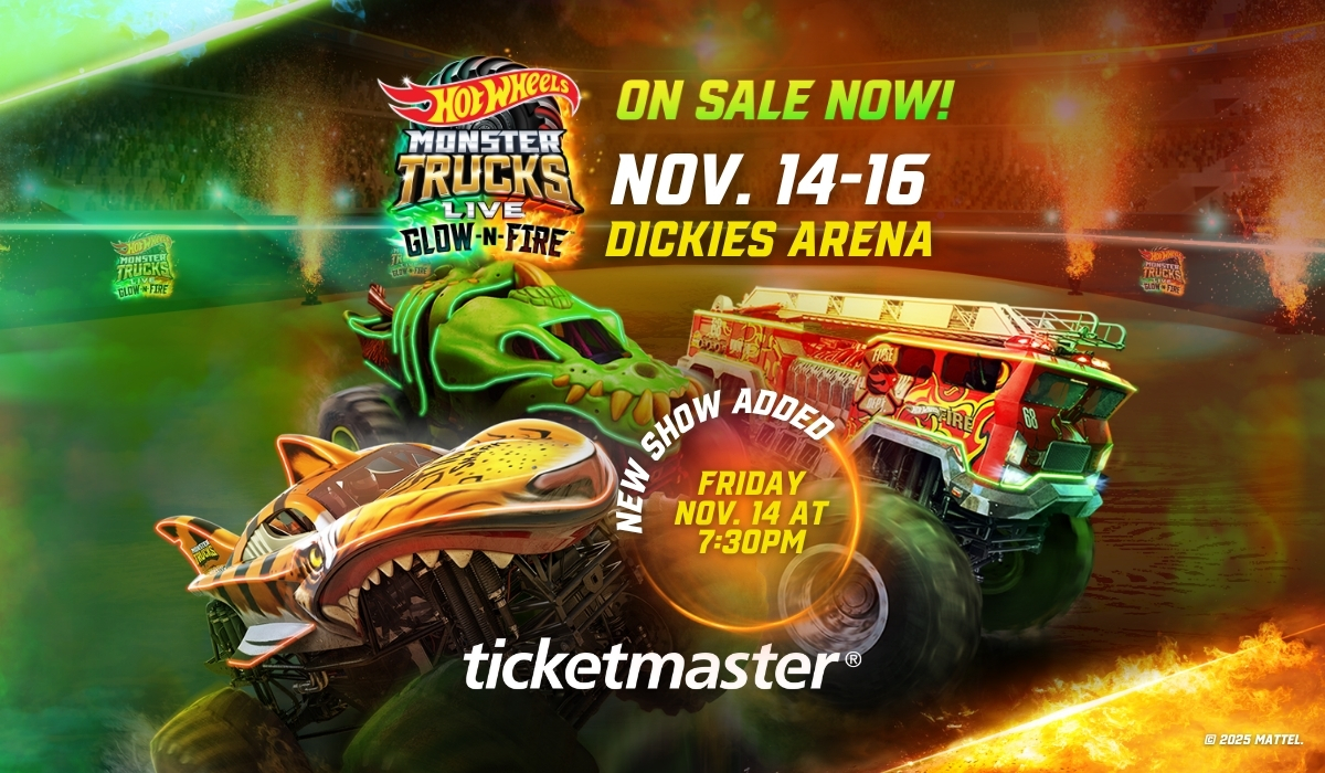 Following the success of Glow Party, Hot Wheels Monster Trucks Live™ is thrilled to announce its new theme for 2025: Glow-N-Fire. This exciting new experience will feature the same level of fun and excitement that fans have come to expect, but with an added fiery twist. Get ready for more heat and action as we continue to bring the ultimate monster truck show to fans at Dickies Arena on November 14-16, 2025!