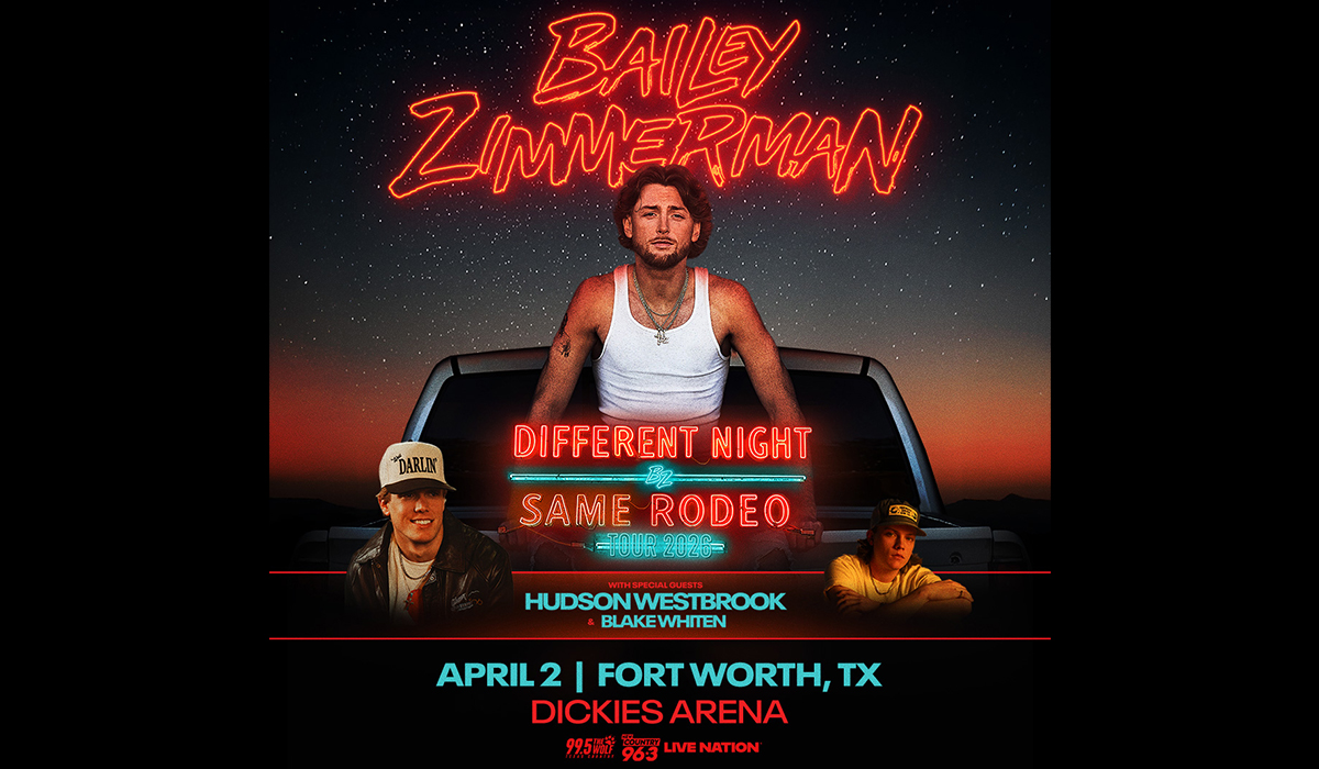 Today, multi-platinum country superstar Bailey Zimmerman is thrilled to announce his 2026 Different Night Same Rodeo Tour to 30+ venues including a stop to Dickies Arena in Fort Worth on Thursday, April 2. Following his sold-out headline trek for his New To Country Tour, Zimmerman will continue to electrify audiences with his dynamic live show across the US and Canada, promoted by Live Nation and featuring support from Hudson Westbrook and Blake Whiten.